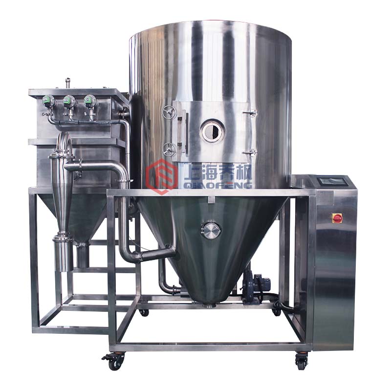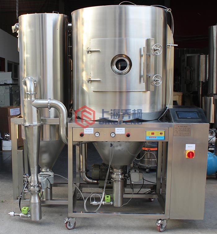 3、當(dāng)干燥室進(jìn)口溫度達(dá)到目180℃~220℃時(shí),開(kāi)啟離心噴頭,當(dāng)噴頭達(dá)到最高轉(zhuǎn)速時(shí),開(kāi)啟進(jìn)料泵,加入料液,進(jìn)料量應(yīng)由小到大,否則將產(chǎn)生粘壁現(xiàn)象,直到調(diào)節(jié)到適當(dāng)量。料液的濃度應(yīng)根據(jù)物料干燥的性質(zhì)溫度來(lái)配制,以保證干燥后成品有良好的流動(dòng)性;