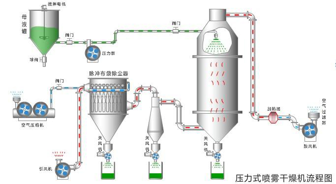 力噴霧干燥塔工作原理如下:通過2-20MPa的高壓將液料(經過過濾的液料)送入壓力式霧化器霧化成小液滴,經過霧化后的液滴(表面積大大增加)與熱空氣充分接觸,在10-30秒內迅速完成干燥過程。得到粉體或細小顆粒的成品。