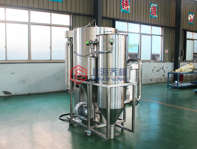 工作過(guò)程是料液通過(guò)氣動(dòng)隔膜泵高壓輸入,噴出霧狀液滴,然后同熱空氣并流下降,大部分粉粒由塔底排料口收集,廢氣及其微小粉末經(jīng)旋風(fēng)分離器分離,廢氣由抽風(fēng)機(jī)排出,粉末由設(shè)在旋風(fēng)分離器下的收粉筒收集,風(fēng)機(jī)出口處還可裝備二級(jí)除塵裝置,回收率在96%-98%。