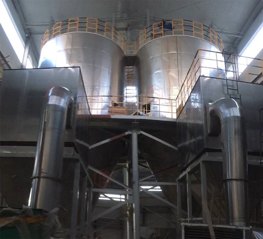 空氣經(jīng)過濾和加熱,進(jìn)入干燥器頂部空氣分配器,熱空氣呈螺旋狀均勻地進(jìn)入干燥室。料液經(jīng)塔體頂部的高速離心霧化器,噴霧成極細(xì)微的霧狀液珠,與熱空氣并流接觸在極短的時(shí)間內(nèi)可干燥為成品。成品連續(xù)地由干燥塔底部和旋風(fēng)分離器中輸出,廢氣由風(fēng)機(jī)排空。